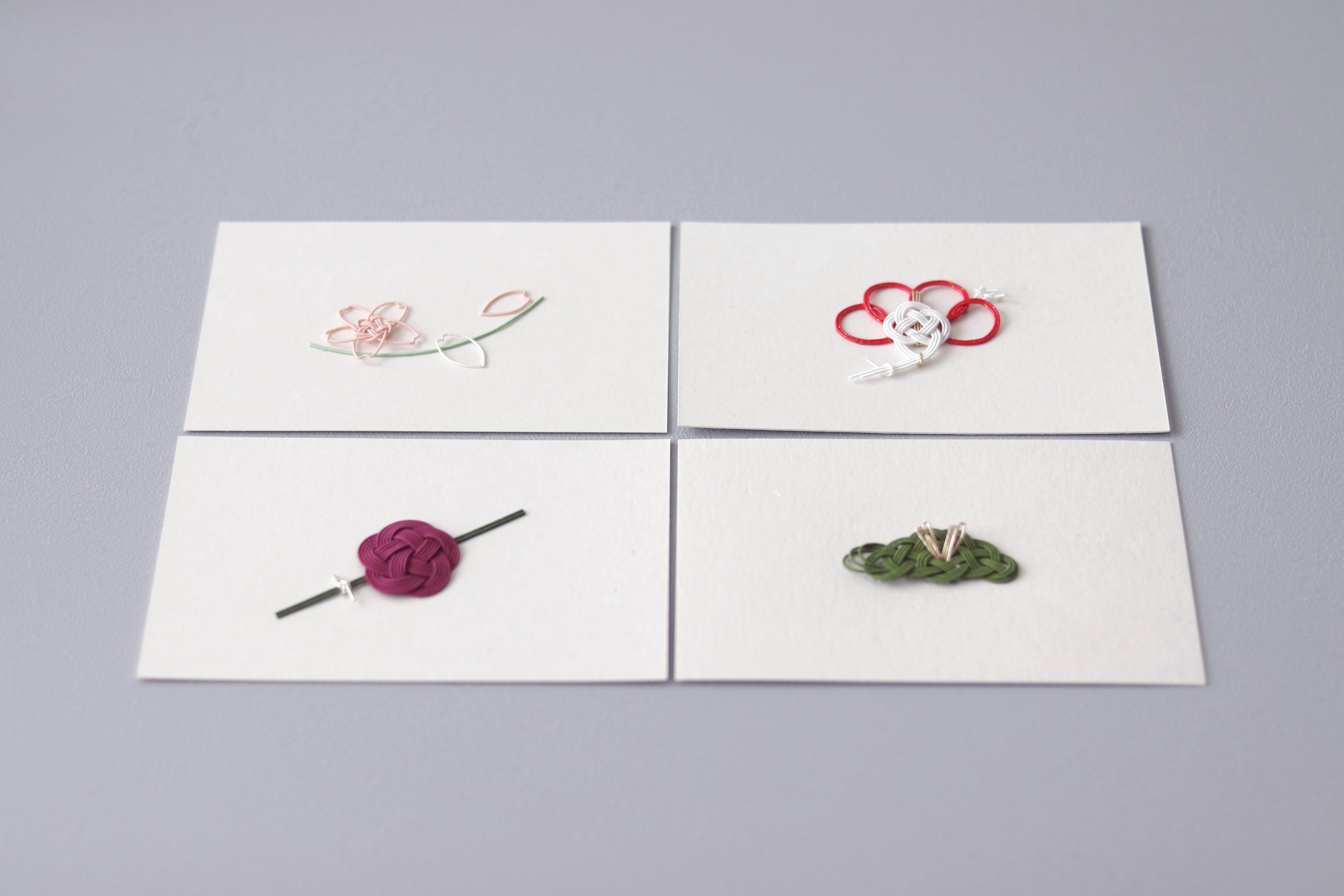 季節の挨拶や、御礼のお手紙など、大切な方へ贈りたい言葉がある時は、縁起の良い水引モチーフが添えられたカードを使ってみませんか。水引の結びには「人と人との縁をつなぐ」という意味があります。どの季節もお使い頂ける吉祥のモチーフ「梅」「松」「鶴」に、日本の美しい春の花「桜」を加えた全四種。